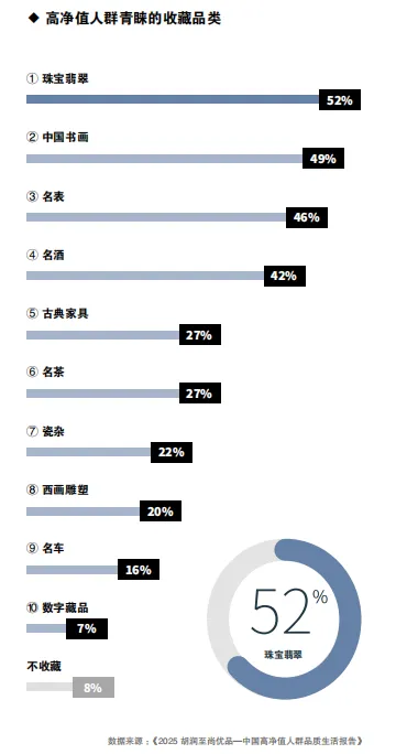 超过90%的高净值人群表示有收藏习惯,其中珠宝翡翠(52%)依然是最受青睐的收藏品类。中国书画(49%)和名表(46%)分别位居第二和第三。值得注意的是,随着AI时代的到来,数字藏品的热度逐渐上升,首次跻身前十名。