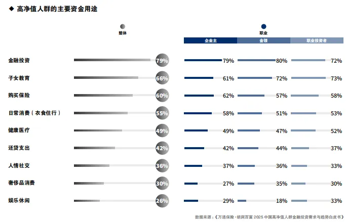 高净值人群将金融投资作为首要资金安排方向,反映其对资产保值增值与财富传承的强烈需求。他们通常具备较高的金融素养和风险意识,倾向于借助专业投资工具规避通胀侵蚀,实现长期财富积累。