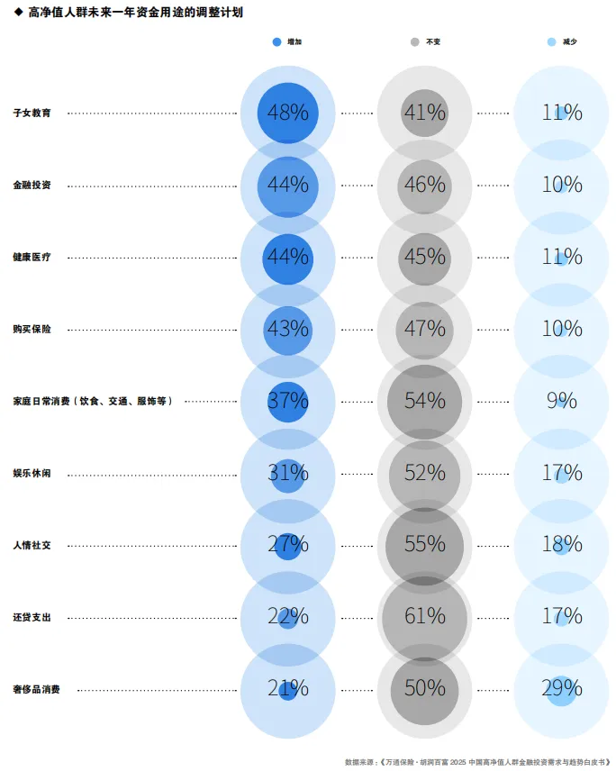在高净值人群未来一年计划增加的项目中,子女教育(48%人、金融投资(44%)、健康医疗(44%)和购买保险(43%)是最受关注的几个方面。