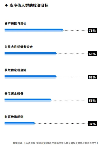具体来看,高净值人群将资产保值与增长列为首要目标,源于其资产构成中企业经营性资产与金融投资占比较高,面临市场波动、经济周期与政策调整等多重风险。因此,他们倾向于通过多元化配置与风险管理工具,抵御通胀侵蚀与市场不确定性,确保财富实际购买力不下降,并实现长期稳健增长。