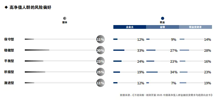 高净值人群的风险偏好整体以稳健型(30%)、积极型(25%)与平衡型(23%)为主。