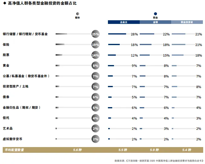 受访高净值人群平均配置5-6种金融投资产品,其中,银行储蓄/银行理财/货币基金占比为25%,保险占比19%,股票占比14%。