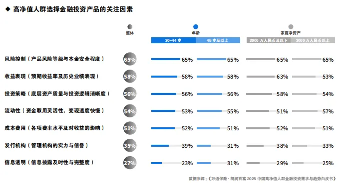 高净值人群普遍重视风险控制,源于其资产规模已达到一定水平,资本保全成为首要目标。历经多轮经济周期后,他们往往形成较强的风险厌恶倾向,关注产品风险等级和本金安全,也反映出对系统性风险及黑天鹅事件的高度警惕。