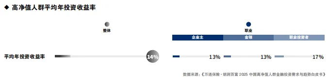 关于高净值人群的平均年投资收益率,整体水平为14%。