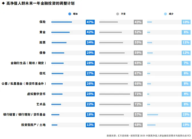 关于高净值人群未来一年计划增加的金融投资类型,保险(47%)、黄金(42%)和股票(34%)位列前三。在计划减少的金融投资方面,高净值人群可能会减少银行储蓄/银行理财/货币基金(25%)、投资型房产/土地(19%)和债券(12%)。