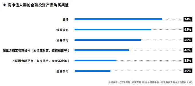 关于高净值人群购买金融投资产品的主要渠道,银行(74%)、保险公司(65%)和证券公司(56%)位居前三。在信息不对称的市场环境中,银行、保险公司与证券公司作为核心渠道,有效发挥了降低交易成本、增强信任的关键作用。