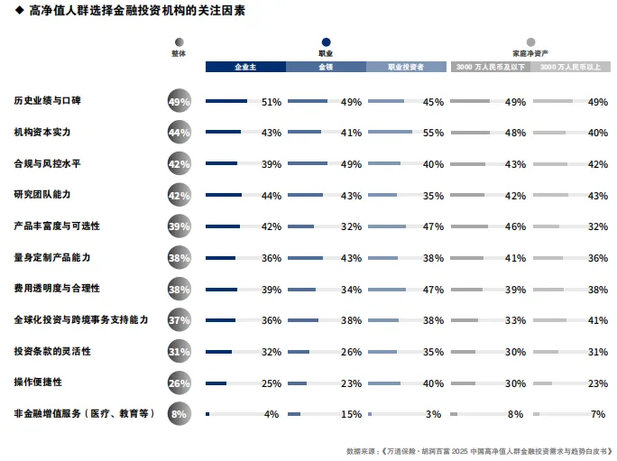 关于高净值人群在选择金融投资机构时的关注因素,整体上,历史业绩与口碑(49%)、机构资本实力(44%)合规与风控水平(42%)以及研究团队能力(42%)最为关键。