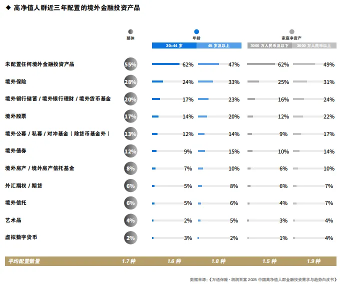 从年龄结构看,45岁及以上人群配置境外保险的比例(33%)明显高于30-44岁人群(24%)。在家庭净资产层面,3000万人民币以上群体配置境外银行储蓄/境外银行理财/境外货币基金(24%:16%)与境外股票(22%:12%)的比例,均显著高于3000万人民币及以下群体。