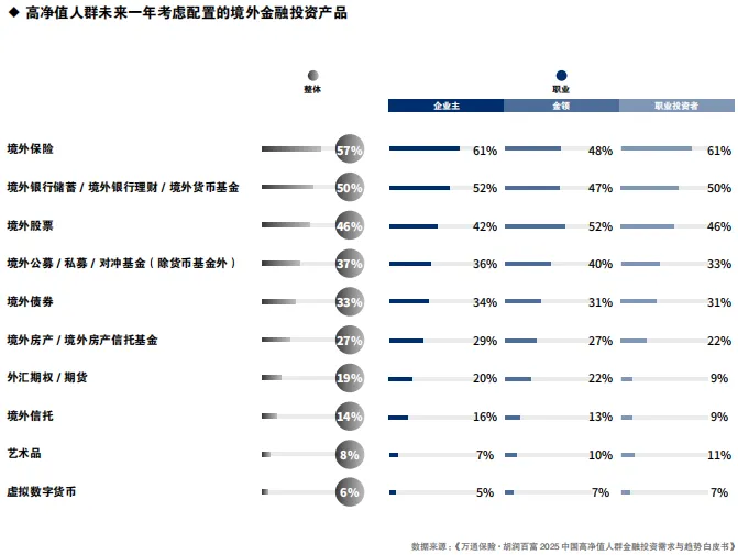 境外银行储蓄/境外银行理财/境外货币基金的高配置意愿,体现出高净值人群在境外市场波动加剧环境下对流动性和本金安全的重视。这类产品风险较低、收益稳定,适合作为境外投资组合中的底层资产,在保障资金安全的同时维持一定的流动性水平。