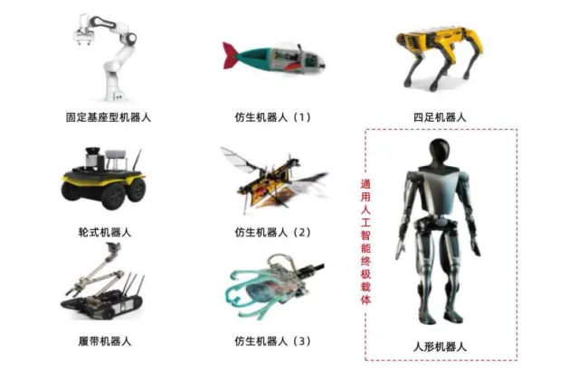 从形态来看,具身智能体涵盖机器人、智能家电等多种形式,其中机器人可分为固定基座型、轮式、履带、四足、人形、仿生六大类,人形机器人被视为通用人工智能(AGI)的终极载体,也是当前产业发展的核心方向。