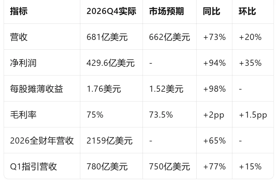 核心结论:英伟达2026财年Q4营收681亿美元、净利润430亿美元均大幅超华尔街预期,Q1指引780亿美元创历史新高。Blackwell架构全面量产,"Agentic AI(智能体AI)"拐点已至。财报发布后盘后股价波动,反映市场对业绩增速从100%+放缓至70%区间的估值分歧,以及云厂商资本支出长期趋势的关注。