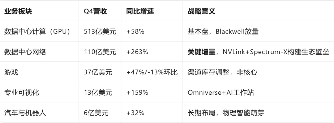 核心洞察:网络收入增速是GPU的4.5倍,说明英伟达成功将客户锁定在"GPU+互连+网络+软件"的全栈解决方案中。客户更换成本极高,生态护城河加深。