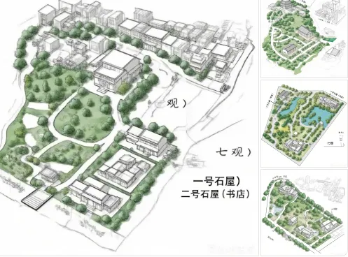 观景节点(七观体系):依据场地高差与视线通廊,精心布置多处看书景点,构建“某阅览屋七观”: