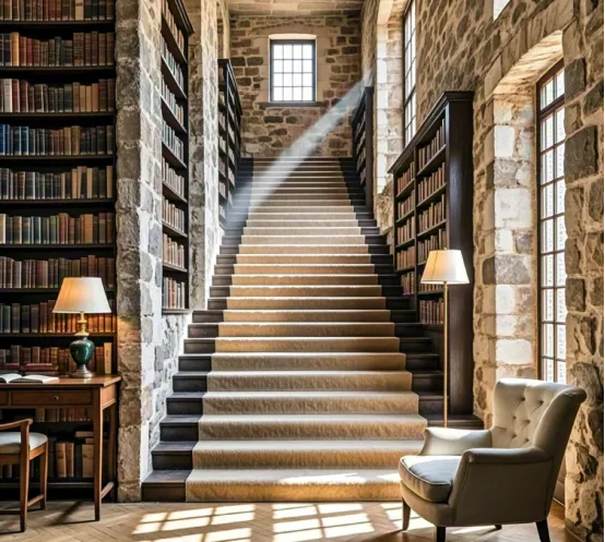 内部陈设:摒弃传统的冰冷书架,采用原木、藤编与石材结合的定制书架。设置阶梯式阅读区,利用高差创造丰富的视觉层次。