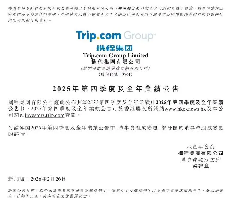 这次消息为携程公布了2025年财报,全年,公司净营业收入为624亿元人民币同比上升17%。归属于携程集团股东的淨利润为333亿元人民币,较2024年171亿元人民币,增加了近95%。