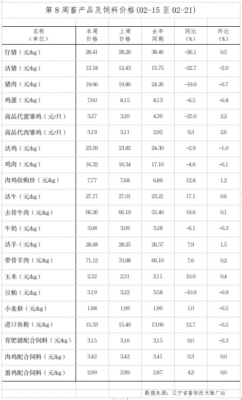 本周全省主要畜产品价格:活猪平均价格为12.18元/公斤,周环比降2.0%,同比降22.7%;猪肉平均价格为19.66元/公斤,周环比降0.7%,同比降19.0%;鸡蛋平均价格为7.60元/公斤,周环比降6.8%,同比降6.5%;肉鸡收购平均价格为7.77元/公斤,周环比涨1.2%,同比涨12.8%;牛奶平均价格为3.08元/公斤,周环比降0.3%,同比降6.1%;活牛平均价格为27.17元/公斤,周环比涨0.6%,同比涨17.1%;去骨牛肉平均价格为66.26元/公斤,周环比涨0.1%,同比涨19.6%;活羊平均价格为28.68元/公斤,周环比涨1.5%,同比涨7.9%;带骨羊肉平均价格为71.12元/公斤,周环比涨0.2%,同比涨7.6%。