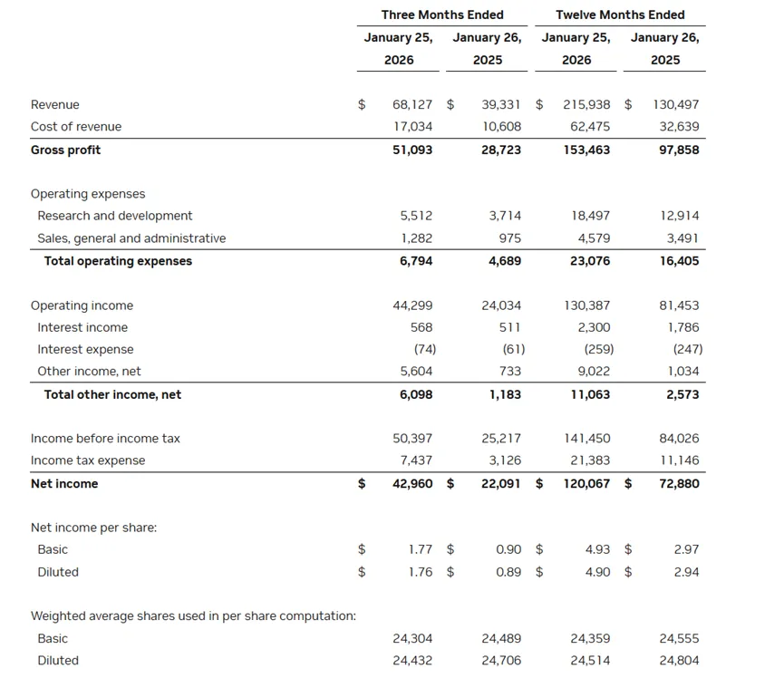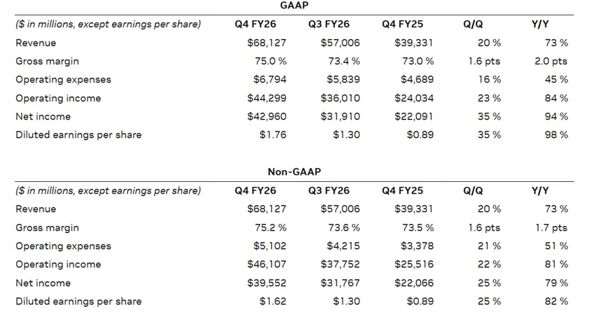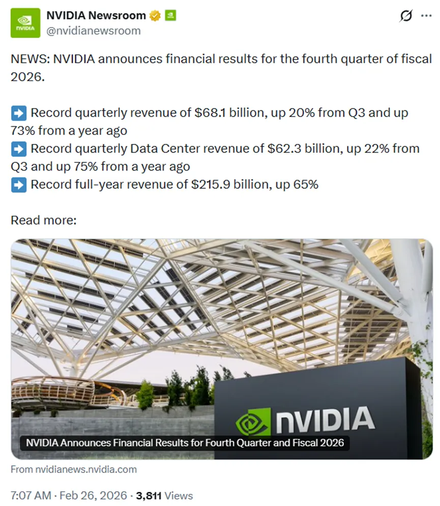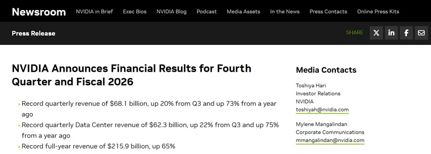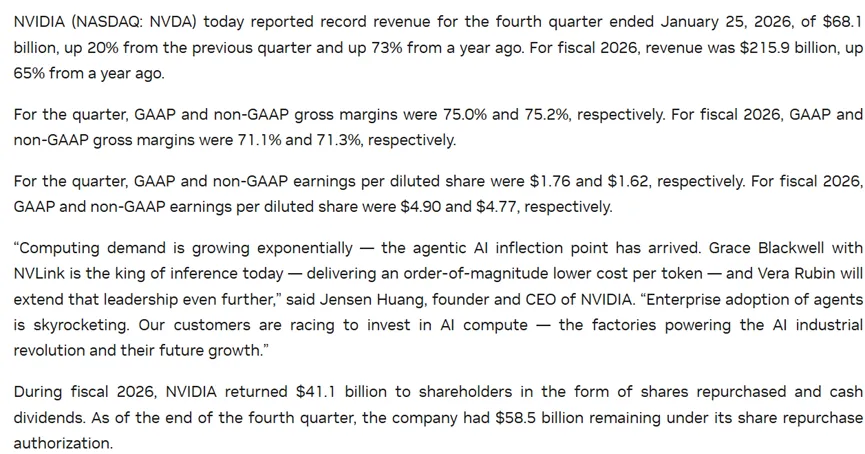 今早7点,全球AI领导者英伟达(Nvidia)公布了2026财年第四季度财务业绩。