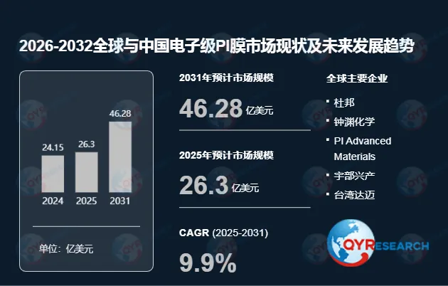 根据QYR(恒州博智)的统计及预测,2025年全球电子级PI膜市场销售额达到了26.3亿美元,预计2031年将达到46.28亿美元,年复合增长率(CAGR)为9.9(2025-2031)。