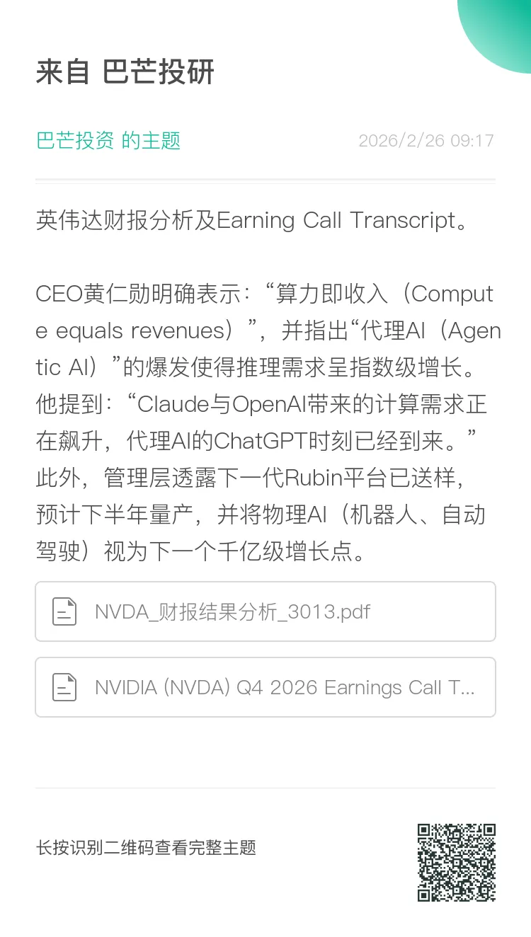 管理层在电话会上释放了极度乐观的信号,强调需求能见度已延伸至2027年。CEO黄仁勋明确表示:“算力即收入(Compute equals revenues)”,并指出“代理AI(Agentic AI)”的爆发使得推理需求呈指数级增长。他提到:“Claude与OpenAI带来的计算需求正在飙升,代理AI的ChatGPT时刻已经到来。”此外,管理层透露下一代Rubin平台已送样,预计下半年量产,并将物理AI(机器人、自动驾驶)视为下一个千亿级增长点。