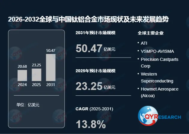 根据QYR(恒州博智)的统计及预测,2025年全球钛铝合金市场销售额达到了23.25亿美元,预计2031年将达到50.47亿美元,年复合增长率(CAGR)为13.8(2025-2031)。