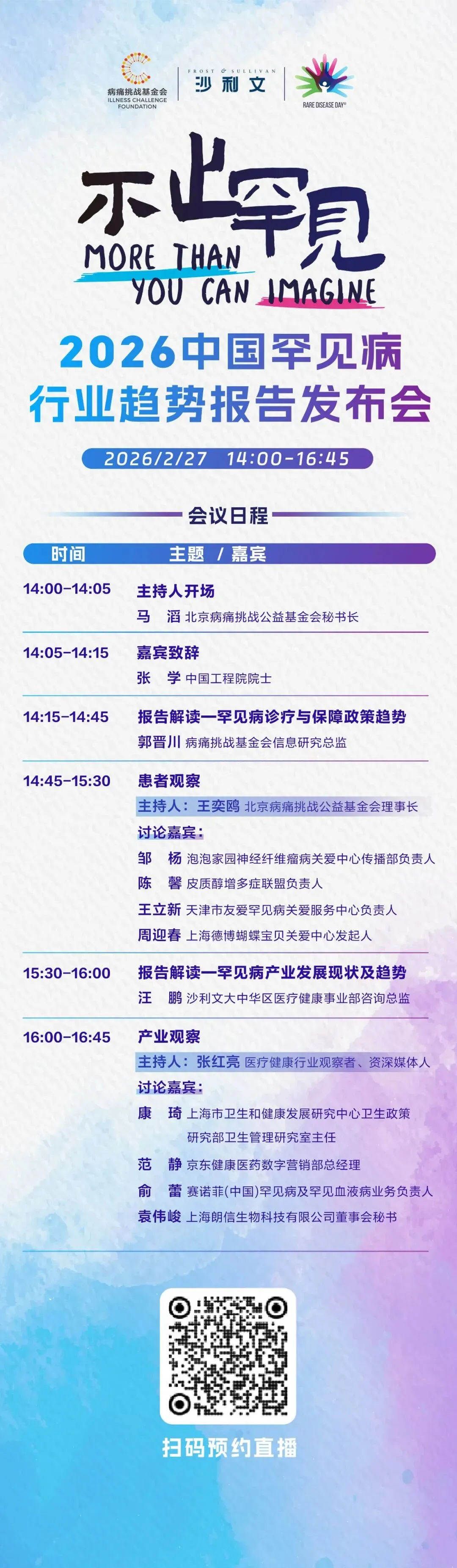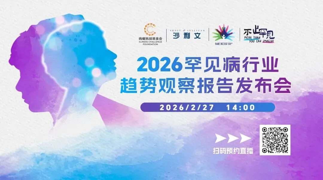 2026年2月27日14点,诚挚邀请您与我们相聚云端,见证《2026罕见病行业趋势观察报告》的重磅发布。这不仅是一份年度观察,更是中国罕见病事业从“边缘生存”跨向“国家议程”的历史实录。