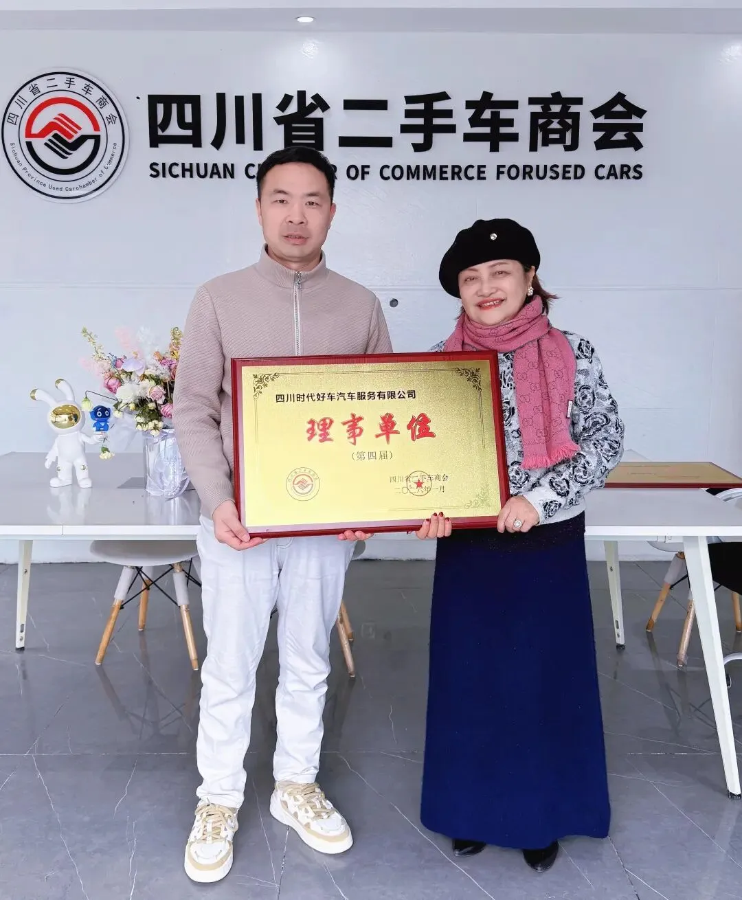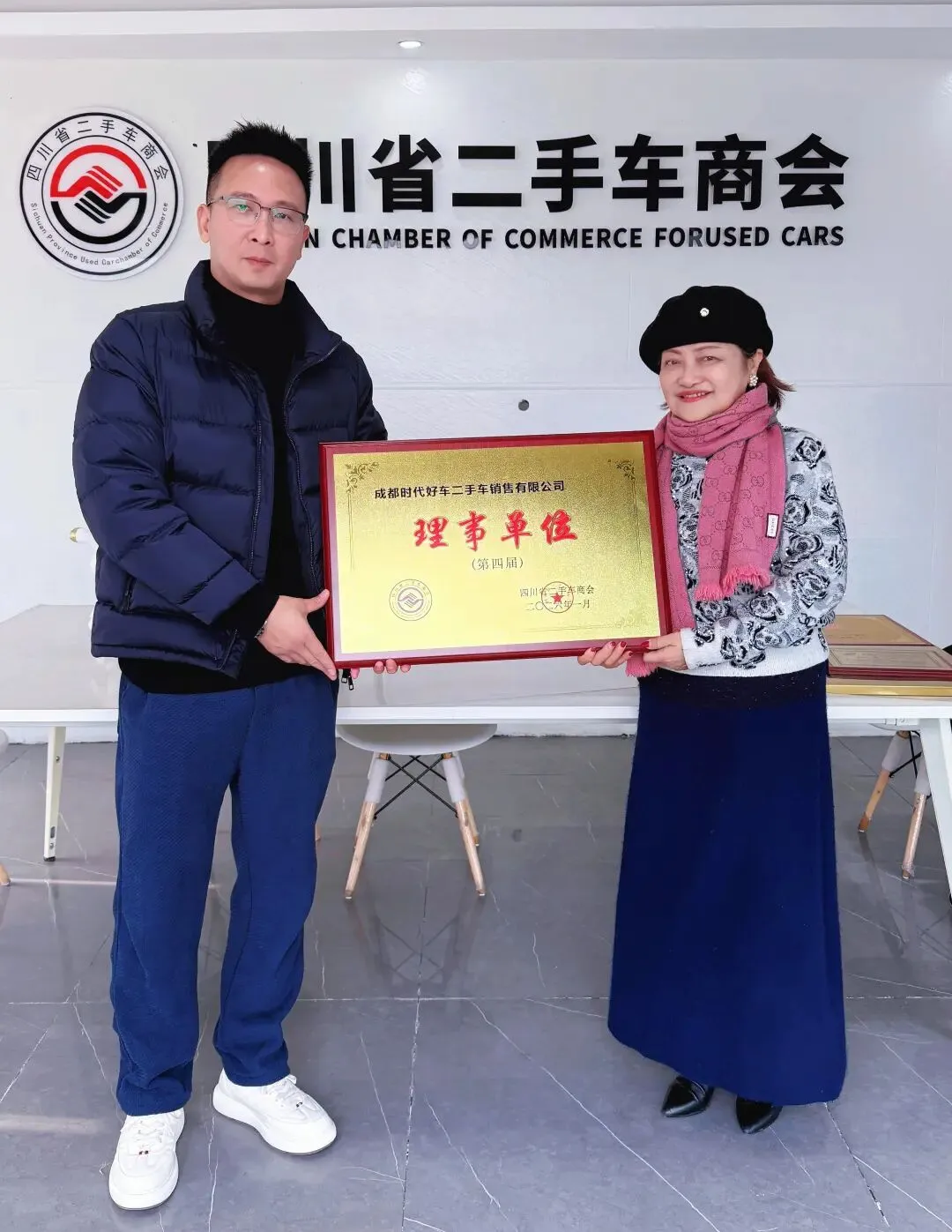 近日,四川省二手车商会副会长黄颖向四川时代好车汽车服务有限公司正式授予理事单位称号,授牌仪式在商会会议室举行,标志着四川时代好车正式开启与商会携手推动行业规范化发展的新篇章。