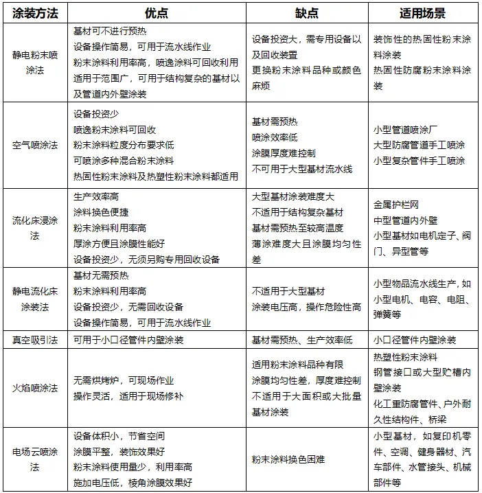 粉末涂料物理状态与传统液态涂料不同,在喷涂工艺上也与液态涂料大相径庭。粉末涂料涂装方法随产品性质、树脂类型或制造工艺不同也各不相同,目前主流的涂装方法是静电粉末涂装法,其余的涂装方法还有空气喷涂法、流化床浸涂法、静电流化床涂装法、真空吸引法、火焰喷涂法、电场云喷涂法等。