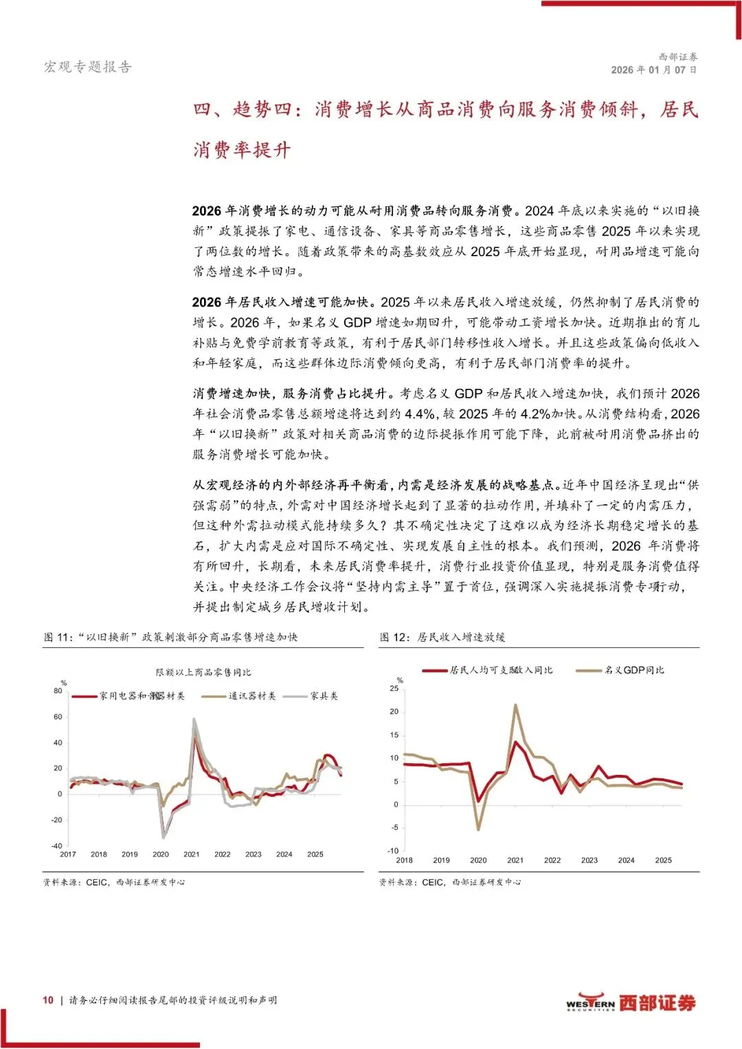 2025年,家电、汽车等“以旧换新”商品成了消费的主力,然而跟着政策效应递减以及高基数效应显现,到2026年消费增长就会更多地被服务消费接力,不管是育儿补贴、免费学前教育等政策致使的转移性收入增多,还是名义GDP回升形成的工资性收入改进,都能够助力提升居民的消费能力,特别是边际消费倾向更高的年轻家庭,这表明餐饮、旅游、文化娱乐、医疗养老等服务性行业,也许在2026年迎来更快的增长机会。