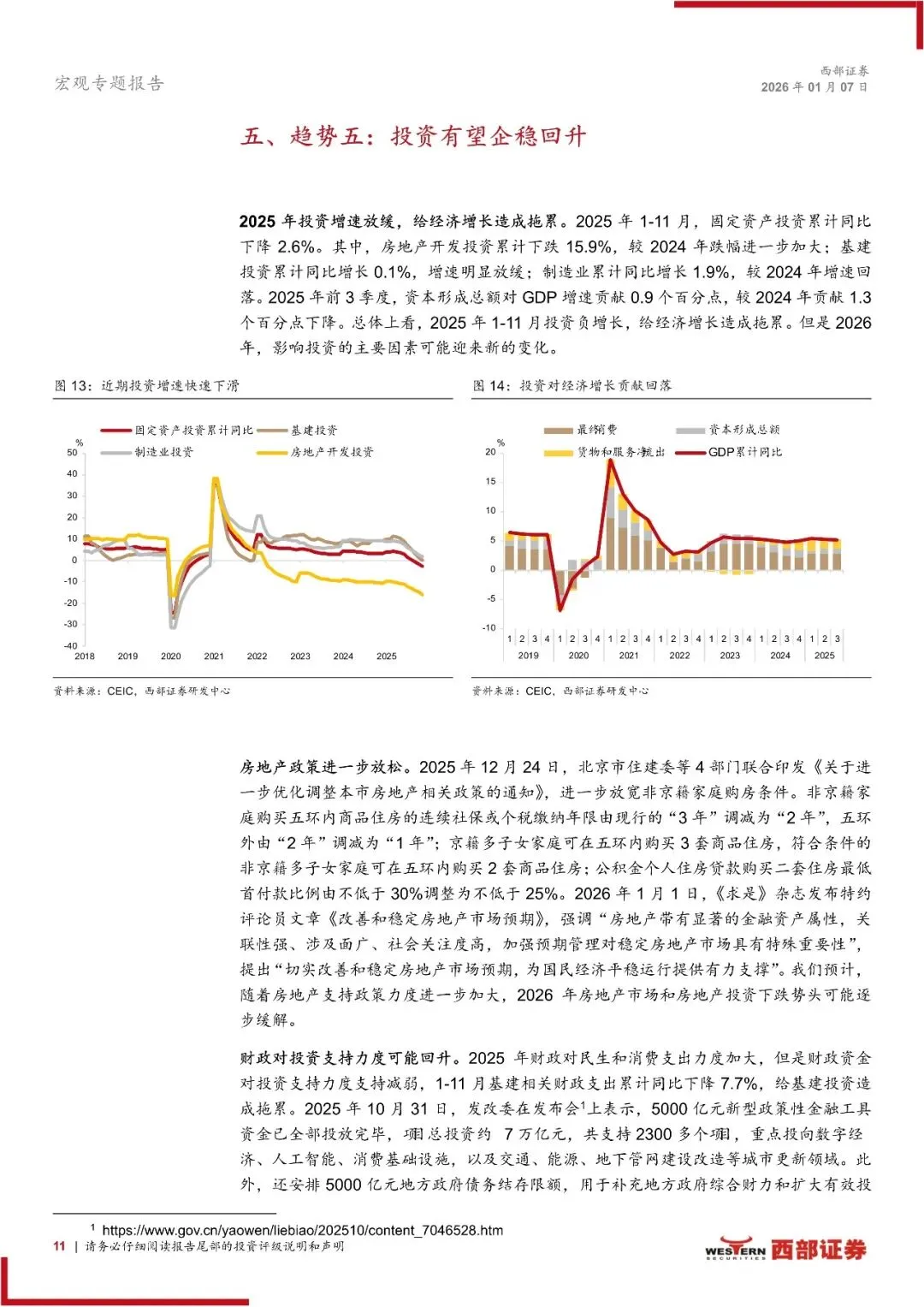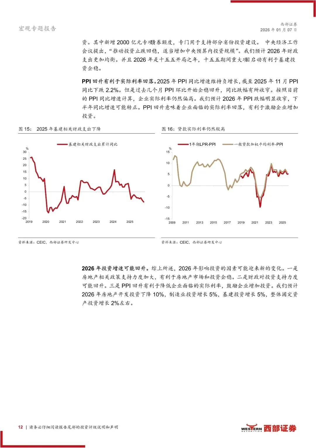 在2025年的时候,固定资产投资呈现出负增长的态势,这对经济而言,是一个极大的拖累。2026年,情况或许会出现转折:其一,一线城市不断地松绑楼市政策,这对使得房地产市场能够止跌回稳有帮助;其二,财政对于投资的关注度有所回升,特别是在“十五五”规划开局的这一年,重大项目将会陆续启动;其三,随着PPI的回升,企业所面临的实际贷款利率下降了,这会对企业的投资意愿起到刺激作用。一方面,有报告做出预测,另一方面,地产投资目前处于下降区间,不过其跌幅会显著收窄,与此同时,要是制造业以及基建投资能够达成大概5%的增长,那么将会促使整体固定资产投资回归到正增长的轨道上。