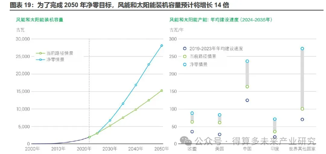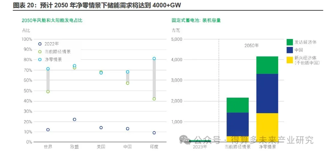 为实现2050年全球能源系统净零排放,风光装机容量还将增长14倍,带动储能需求达到4000+GW(截止2024年全球新型储能累计装机规模仅165.4GW)。到2050年,全球能源转型的核心目标是在<<巴黎协定>>框架下实现能源系统净零排放。根据<<bp世界能源展望2024版>>,到2050年,在"当前路径情景"中,风能和太阳能装机容量将增加约8倍,如果实现2050年能源系统净零排放,则在"净零情景"下产能将增加14倍的风能和太阳能装机容量,带动储能需求将达到4000+GW。