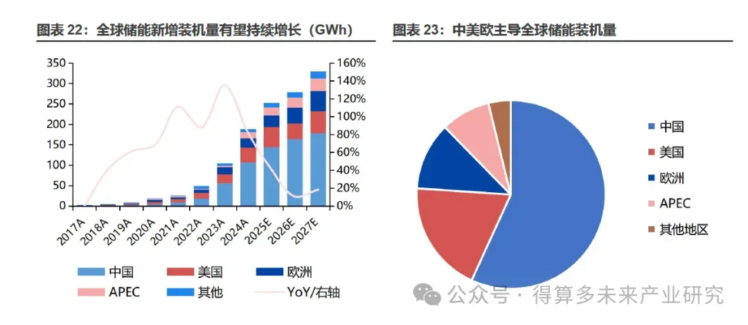 展望:我们预计2025-2027年全球储能新增装机量将持续增长。1)中国市场:新增装机量由电网侧储能驱动,2024年占比60.0%,较2023年增加7.6%;其中独立储能占57.6%,是最主要的装机应用场景,随着各地配建储能转独立储能政策的推进,预计2025年独立储能新增装机占比将会持续增高。但考虑地面电站光伏新增装机增速放缓,工商储潜力较大,预计中国储能需求将平稳小幅增长。2)美国市场:装机以大储为主,户储需求将随着加州NEM3.0政策推动和利率的持续下探小规模增长。预计2025年美国储能因关税影响及"受关注外国实体"条款而加速发货,2026年储能需求会因政策变化而收缩,2027年之后恢复增长。3)欧洲市场:以户储需求高而被熟知,主要市场为德国、意大利和英国等地。为了完成净零排放,欧洲需要继续保持光伏年装机增长,带动储能需求增长,结构上欧洲工商业储能及大储需求增速较户储更显著。3)新兴市场:除了中美欧三大传统市场以外,新兴市场中APEC占比8%,其他地区占比4%。虽然目前新兴市场占比低,但预计受刚需和电价等现实因素影响,叠加强制或补贴等政策因素驱动,这些地区需求发展潜力较大。综上,预计全球储能2025年将继续保持较快增长,2026年全球储能因美国政策波动、中国源网侧储能装机逐渐饱和而增速有所放缓,2027年随着欧洲大储的快速崛起以及新兴市场持续增长带动全球增速有所反弹。