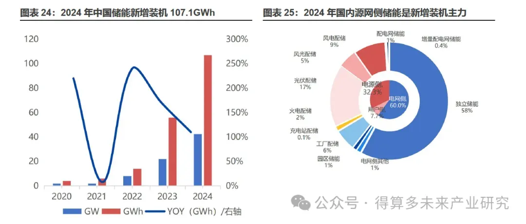 2024年国内新型储能装机中源网侧储能是新增装机主力,合计占比达 92.3%。中国新型储能装机主要分为电源侧(独立储能为主)、电网侧(风光配储为主)和用户侧(工厂园区为主)。根据EESA统计,2024年中国储能新增装机规模达到了42.5GW/107.1GWh。从2024年储能装机应用场景来看,电网侧储能是新增装机主力,占比达到6o.0%(装机能量口径),其中独立储能占57.6%,是最主要的装机应用场景。随着各地配建储能转独立储能政策的推进,预计2025年独立储能新增装机占比将会进一步提升。电源侧储能占比32.3%,其中光伏及风电配储合计占比30.9%。用户侧储能占比7.7%,其中工厂配储是最主要的场景,此外储能在园区配储、光储充等场景下的应用也在逐渐增多。