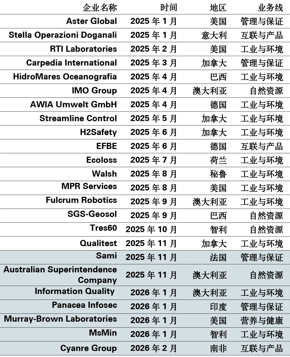 2026年1月, SGS 完成对ATS的战略收购,这是SGS 历史上规模最大的一笔交易。ATS是北美地区专业测试、检验、校准及取证解决方案的领先供应商,预计在2026年协同效应显现前,将带来4.6亿美元销售额和9500万美元EBITDA。拥有近60年历史的ATS是一家实力雄厚、业务多元化的纯美国企业,凭借强大的品牌和服务文化,在制造业、航空航天与国防、发电与配电以及保险等受监管且高增长的终端市场提供解决方案和服务。