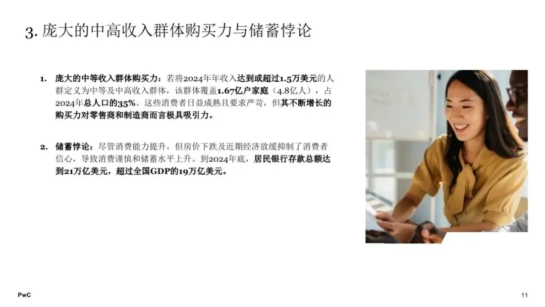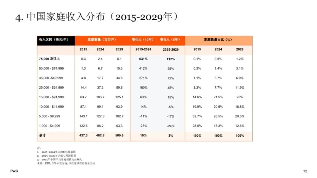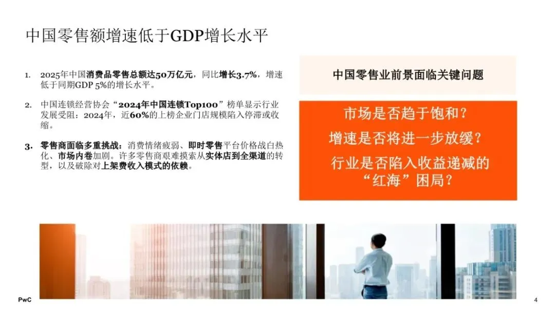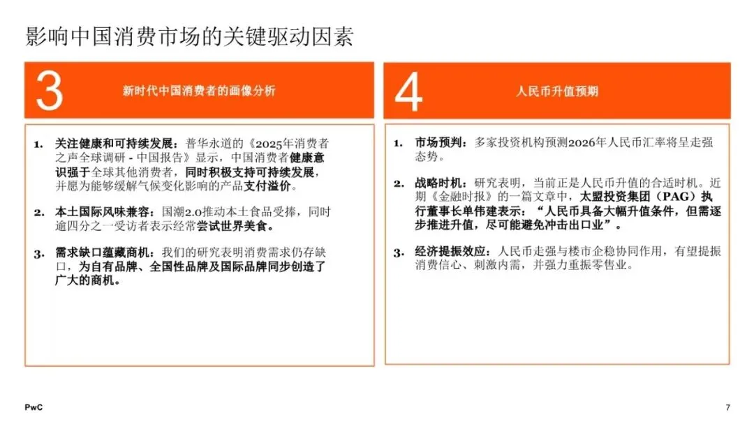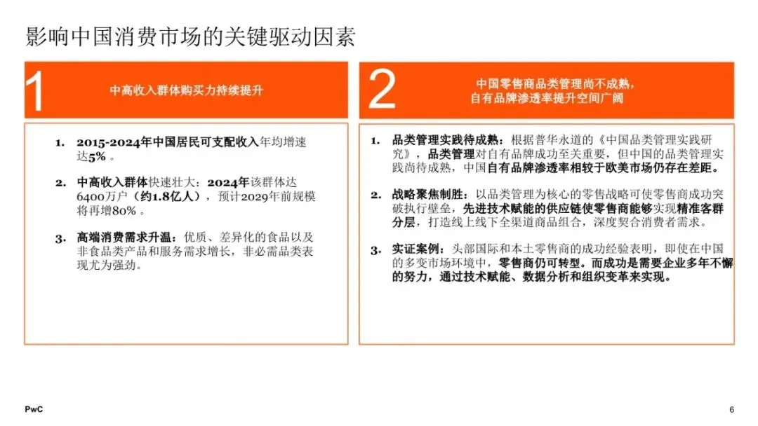 这份报告由普华永道中国消费市场行业主管余叶嘉莉于2025年1月发布,核心观点是中国消费市场前景展望乐观,尽管当前面临诸多挑战,但存在四大关键有利因素支撑市场长期向好。中国零售业正经历转型阵痛。2025年中国消费品零售总额预计达50万亿元,同比增长3.7%,但这一增速低于同期GDP 5%的增长水平。更值得关注的是,中国连锁经营协会"2024年中国连锁Top100"榜单显示,近60%的上榜企业门店规模陷入停滞或收缩。零售商面临三重压力:消费情绪疲弱、即时零售平台价格战白热化、市场内卷加剧。许多零售商艰难摸索从实体店到全渠道的转型,同时试图破除对上架费收入模式的依赖。尽管困难重重,报告识别出支撑市场前景积极向好的四大支柱:第一,中高收入群体购买力持续提升。 这是最根本的驱动力。过去十年,中国居民可支配收入年均增速达5%,中高收入群体快速壮大。2024年该群体已达6400万户(约1.8亿人),预计2029年前规模将再增80%。高端消费需求持续升温,优质、差异化的食品以及非食品类产品和服务需求增长强劲。第二,零售商品类管理升级与自有品牌潜力释放。 中国零售商品类管理实践尚不成熟,自有品牌渗透率相较于欧美市场仍存在巨大差距,这意味着提升空间广阔。第三,新时代中国消费者特征鲜明。 中国消费者在健康、可持续和对国际产品的接受度方面超越了全球其他消费者,创造了新的商机。第四,人民币升值预期。 多家投资机构预测2026年人民币汇率将呈走强态势,这有望提振消费信心、释放消费潜能。中国居民实际可支配收入在过去十年间稳步增长。2015-2024年期间,居民实际可支配收入年均增长约5%;预计2025-2029年,这一增速将维持在3.99%-4.7%之间。过去十年,中国人均GDP从2015年的8,175美元上升至2024年的13,303美元,累计增长63%。根据经济学人智库估算,年可支配收入25,000美元及以上的家庭数量在过去十年中增长了三倍,从2,100万户增至6,400万户,并预计到2029年将进一步接近翻倍,达到1.16亿户(约3.3亿人)。年收入超过35,000美元的家庭数量在2024年达到2,680万户,预计在未来五年将增至5,600万户(约1.61亿人)。在这一收入水平的人口规模上,中国仅次于美国,位居全球第二。若将2024年年收入达到或超过1.5万美元的人群定义为中等及中高收入群体,该群体覆盖1.67亿户家庭(4.8亿人),占2024年总人口的35%。这些消费者日益成熟且要求严苛,但其不断增长的购买力对零售商和制造商而言极具吸引力。然而,存在一个"储蓄悖论":尽管消费能力提升,但房价下跌及近期经济放缓抑制了消费者信心,导致消费谨慎和储蓄水平上升。到2024年底,居民银行存款总额达到21万亿美元,超过全国GDP的19万亿美元。这既是挑战,也意味着巨大的潜在消费能力待释放。2015年至2024年间,低收入家庭(年收入低于1万美元)数量减少了5,000万户,降至2.16亿户。预计到2029年这一数字将进一步降至1.66亿户。过去十年间,约1.44亿人成功脱离了低收入行列。但到2029年,仍有33%的人口面临可负担性问题,这为零售商开发"品质够用"的自有品牌产品提供了充分理由。中国的私人消费占GDP比重历来偏低(约40%),远低于西方主要经济体(美国为68%,英国为61%)。经济学人智库预测,到2029年私人消费占比将升至43%。这一增长将带来可观的消费增量。以2024年GDP为基准计算,私人消费占比每提升1个百分点,将对应约1,900亿美元的消费增量。若未来几年人民币汇率走强,再配合政府刺激措施,消费者信心预计将显著回升。品类管理并非新概念,其具体涵盖五大决策:供应商关系、定价、选品组合规划、促销陈列以及自有品牌管理。21世纪前十年,零售商首要关注门店的高速扩张,因为彼时仅需向供应商收取上架费已足够成为有效的收入模式。而现阶段消费情绪低迷,零售商应通过线上线下全渠道协同发力,为目标客群提供合理定价与精准选品,并优化全流程购物体验,以激活消费潜力。品类管理可同步提升顾客满意度与零售商经营表现。精于品类管理的零售商能够在品类精选、组合规模控制及自有品牌与全国性品牌配比等关键环节实现最优决策,从而重构传统零售模式,避免过度依赖由供应商主导选品并向其收取上架费等费用的收入模式。零售商无法单独完成品类管理。 品类管理是零售商与供应商将品类作为战略业务单元进行共同管理的协作流程,通过专注价值交付来提升整体业务成效。普华永道对12家食品杂货零售商、159家门店的研究显示,中西方零售商在品类管理的成熟度上存在差距:中国零售商的优势在于:低缺货率(平均维持在约2%的低位水平),以及技术应用的早期推动(部分领先零售商已经实现高度技术驱动的线上线下融合,并具备即时配送能力)。西方零售商的优势在于:零售商与供应商关系更为紧密;成熟的自有品牌体系;普遍采用"品类队长"模式(由一家领先的供应商代表零售商管理某个产品品类)。有效的品类管理需要零售商与供应商之间建立长期、以信任为基础的合作关系。稳固的供应商伙伴关系有助于形成品类愿景共识、共同推动创新,并在长期内实现可持续的利润提升。过去,传统零售商扮演着分销商的角色——通过收取进场费、陈列费和渠道费来提供货架空间。如今,焦点已转向产品本身的盈利能力。高端会员制零售商很少收取此类费用,更多在寻求差异化的明星单品。对零售商而言,需要与供