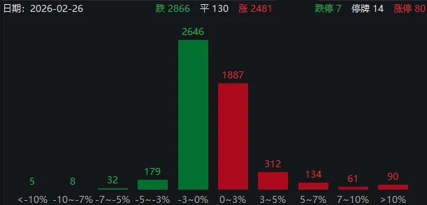 板块题材上,CPO、铜缆高速连接、光纤、PCB、液冷服务器、风电设备、航空发动机、培育钻石、半导体、代糖概念股涨幅居前;影视院线、保险、房地产、短剧游戏、汽车整车、贵金属、免税店、白酒、零售板块跌幅居前。盘面上,隔夜英伟达财报超预期提振AI产业链情绪,CPO、铜缆、液冷服务器、PCB等AI硬件股集体大涨,天孚通信、亨通光电、申菱环境、华丰科技多股盘中创出历史新高。国产算力芯片股同样受益AI浪潮集体上扬,寒武纪午后一度涨近10%。商业航天板块午后活跃,电科蓝天、航天动力涨幅居前。此外,电网设备、培育钻石、环保板块盘中亦有拉升。另一方面,影视院线板块延续弱势,博纳影业尾盘再度跌停。