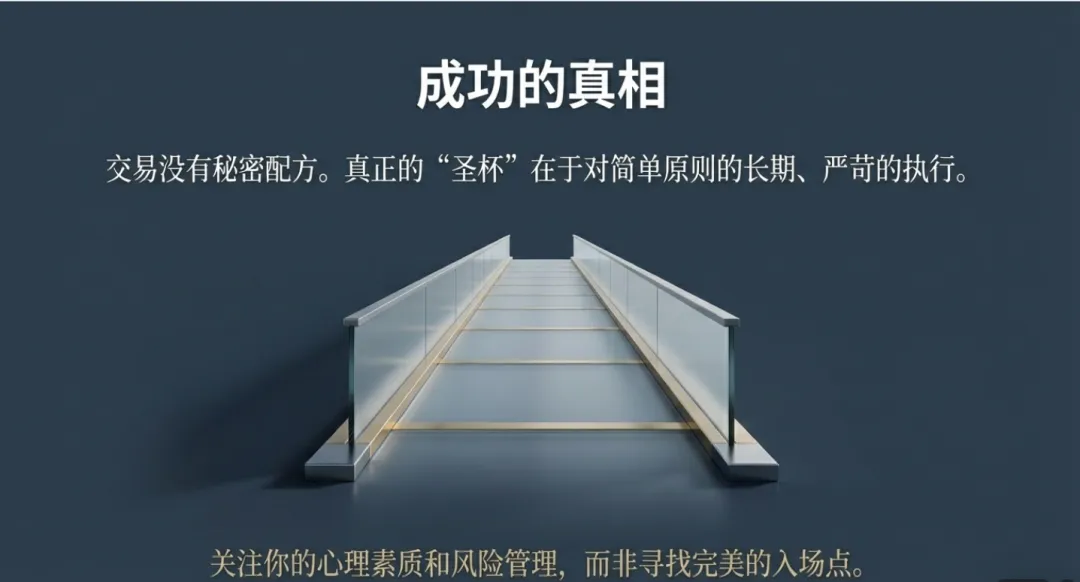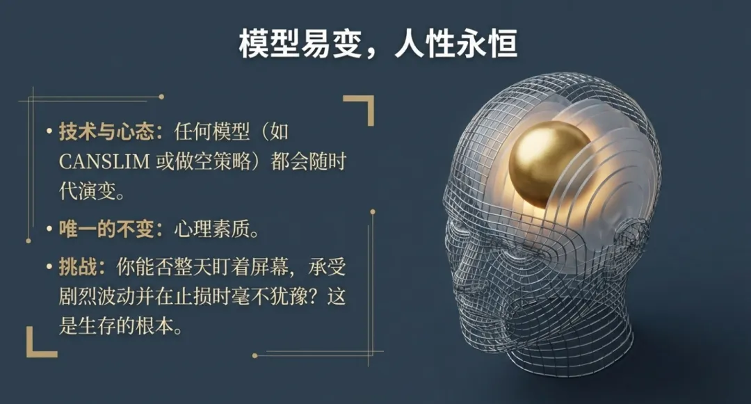 最终,交易的胜负不取决于你是否采用了CAN SLIM模型或某种特定指标,而取决于你的**气质(Temperament)**是否与策略框架匹配。科伊尔强调,没有一种“唯一的正确方法”,只有适合个人的“广义策略框架(Generalized Strategy)”。总结而言,成功的交易并非来自对魔法模型的寻觅,而是源于对基本原则近乎严苛的纪律执行。无论是百年前的纸带,还是当代的AI,盈利的灵魂始终建立在尊重趋势、截断亏损与性格匹配的基础之上。