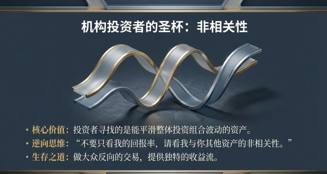 在职业化道路上,交易员必须在“个人盈利”与“资本管理业务”之间做出架构抉择。4.1 投资者眼中的价值:策略的非相关性(Non-correlation)
