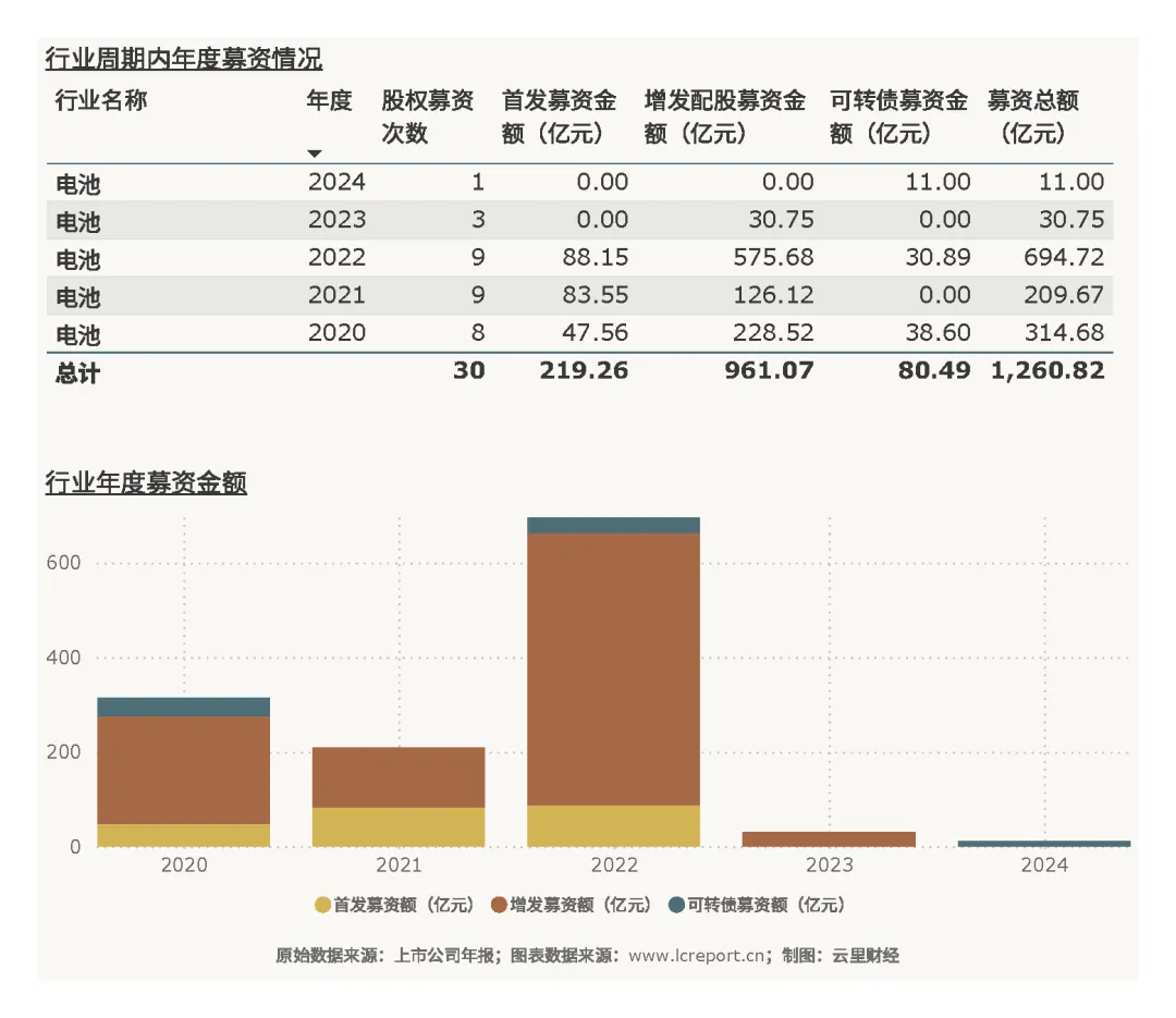 以五年为周期(指从2020Q4-2025Q3,下同),电池板块共发生股权融资事件30起,累计募资达1,260亿元。显然股权融资成为行业股本扩张的重要推手——不过高峰期已经过去。