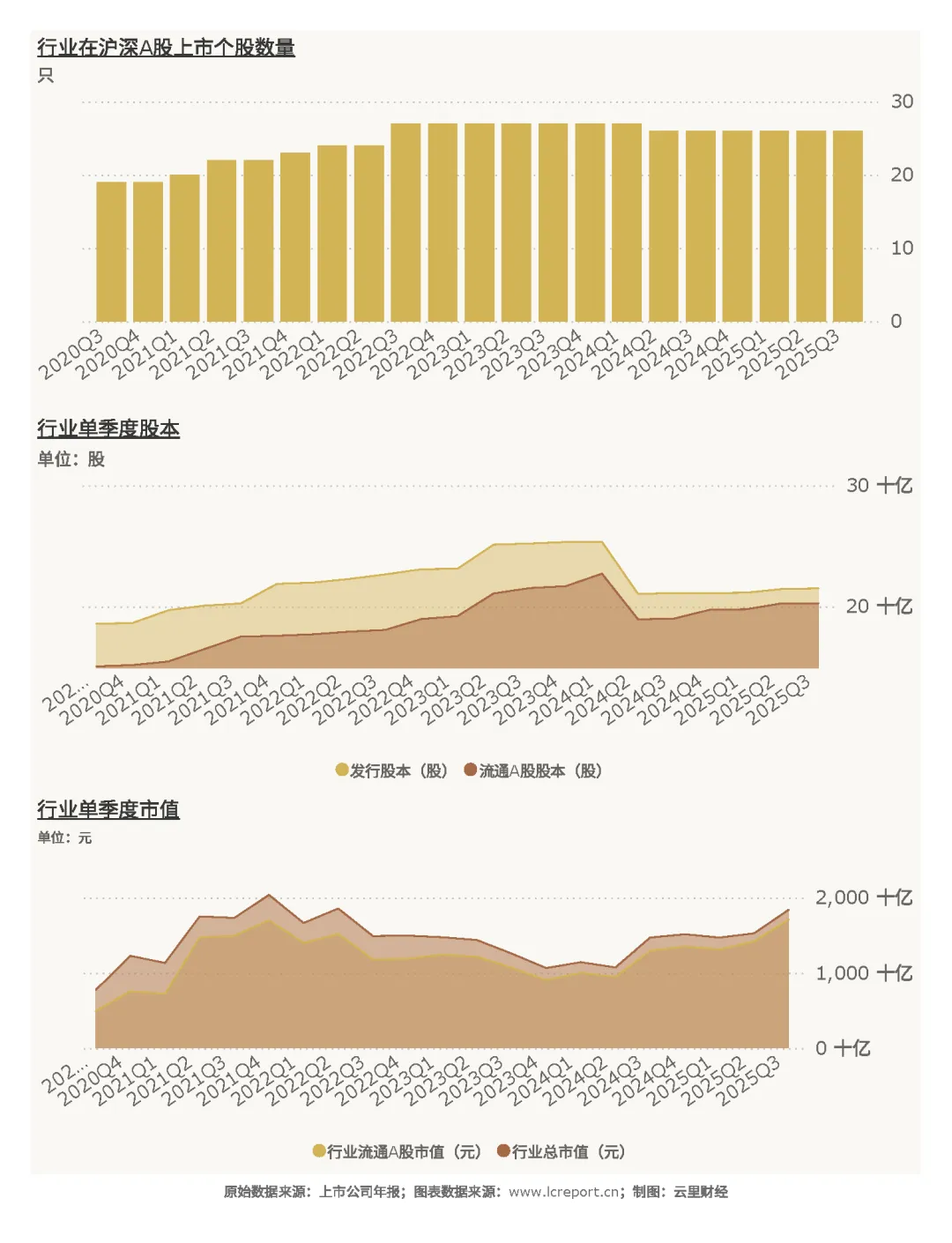 截止至2025Q3季度,电池业[2]共有上市公司[3]26家,流通A股的股本为202.70亿股,流通市值为17,090.92亿元。