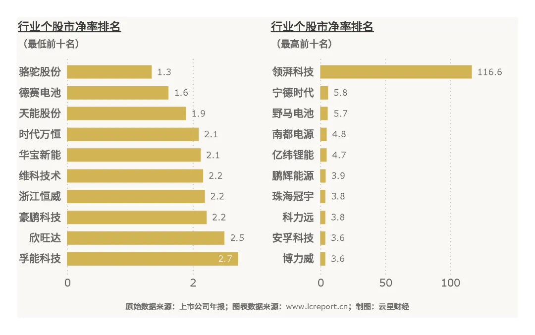 该板块当季无破净股[5],说明行业整体资产仍具备市场溢价,行业基本面未出现整体性恶化;市净率最小的个股是骆驼股份(601311),市净率为1.34倍;而市净率最大的是领湃科技(300530),当季市净率为116.60倍。领湃科技外,宁德时代以5.8倍的市净率居行业第二位,显然尽管宁德时代在持续高增长态势下,营收和利润的基数已经不断扩大,而股价涨幅也显著,但资金依然看好其成长性。