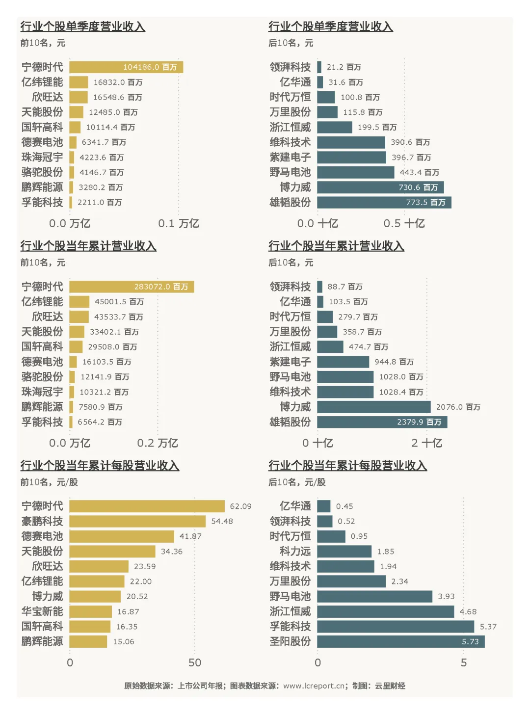 个股单季度营收最大值(1,041.86亿元)、今年前3个季度累计营收最大值(2,830.72亿元,以及累计每股营收最大值(62.09元/股)均由宁德时代(300750)贡献;而领湃科技创造了行业单季度营收和累计营收最小值,而累计每股营收最小值为亿华通的0.45元/股。