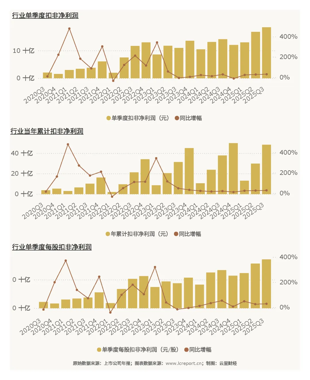 电池业在2025Q3季度总实现扣非净利润为184.50亿元、同比增长30.51%,今年前3个季度累计实现扣非净利润482.31亿元,同比增长27.60%;当季每股扣非净利润为0.8583元,同比增长28.220%。行业扣非净利润增幅高于营收增幅,体现出行业整体盈利效率的提升,盈利增长的质量优于营收增长。