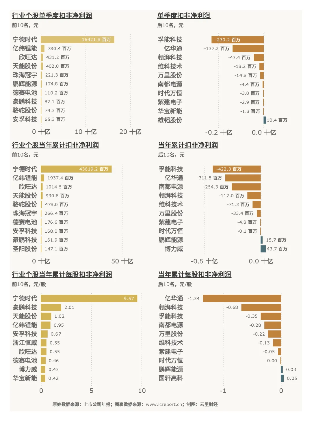 当季扣非净利润最大值为宁德时代(300750)的164.22亿元,当季扣非净利润最小值为孚能科技(688567)的-2.30亿元(负值为亏损),该行业当季平均扣非净利润为7.10亿元;当年累计扣非净利润最大值为宁德时代(300750)的436.19亿元,累计扣非净利润最小值为孚能科技(688567)的-4.22亿元(负值为亏损);前3个季度,累计每股扣非净利润最大值为宁德时代(300750)的9.57元/股,累计每股扣非净利润最小值为亿华通(688339)的-1.34元/股(负值为亏损)。