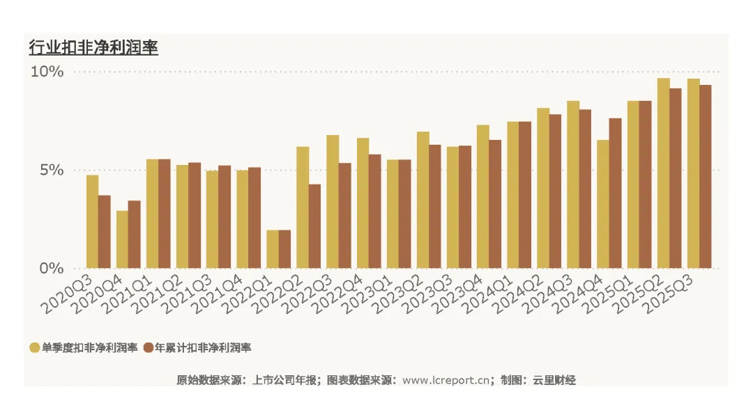 2025Q3季度电池业的当季平均扣非净利润率为9.62 %,前3个季度累计扣非净利润率为9.30%。周期内该板块整体盈利效率处于上升区间,显示盈利质量的持续提升。