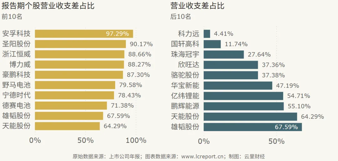 个股中,以营业收支差占利润总额比例为标准,主营业务盈利能力最强的个股是安孚科技(603031),营业收支差占利润总额比例达到97.29%,其他还包括圣阳股份、野马电池和宁德时代等个股;主营业务盈利能力相对最弱的个股是科力远(600478),营业收支差占比仅4.41%,国轩高科、欣旺达和骆驼股份等主营业务盈利能力也相对较弱,显示这些公司经营的核心竞争力缺失;而孚能科技(688567)、亿华通(688339)等的营业收支差为负值,主营业务录得亏损,显然其核心产品或业务模式存在问题,无法通过主营业务实现盈利,企业经营面临根本性挑战。