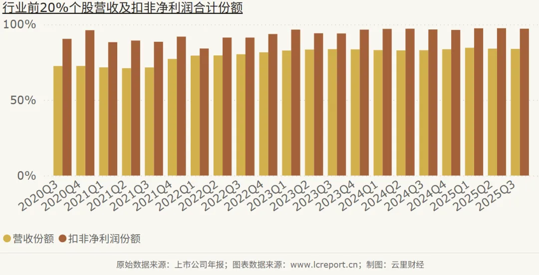 4)行业盈利分化态势加剧,营收和利润集中度均处于极高水平,且利润集中度远高于营收集中度,马太效应凸显,中小企业在市场份额和利润获取上均处于绝对劣势。