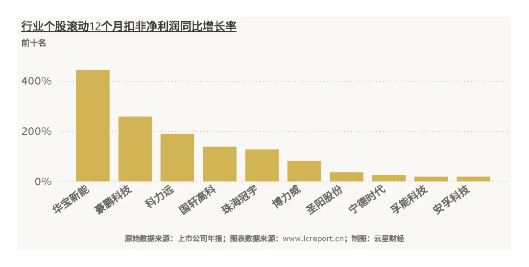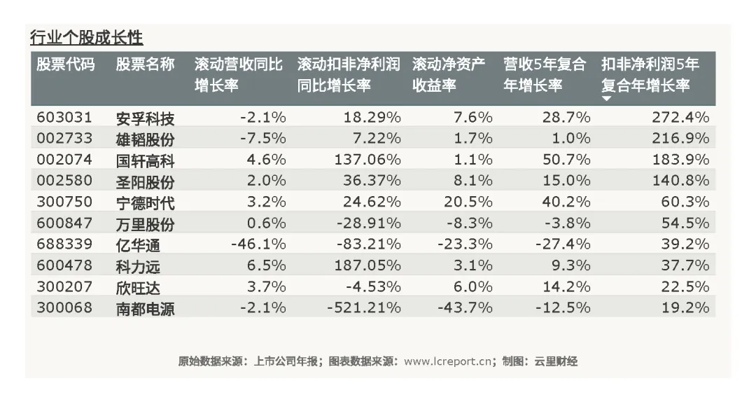 我们用扣非净利润五年复合年均增长率衡量的话,成长性最好的个股(扣除年累计扣非净利润为负值的个股)是安孚科技(603031),扣非净利润复合年增长率为272.44 %;成长性最弱的个股是鹏辉能源(300438),扣非净利润五年复合年均增长率仅-42.67 %。安孚科技的长期高复合增速体现了其核心业务的持续成长能力;龙头宁德时代虽未登顶,但60.3%的五年复合增速兼具规模和成长,展现出稳健的长期成长性,成为行业成长的压舱石。