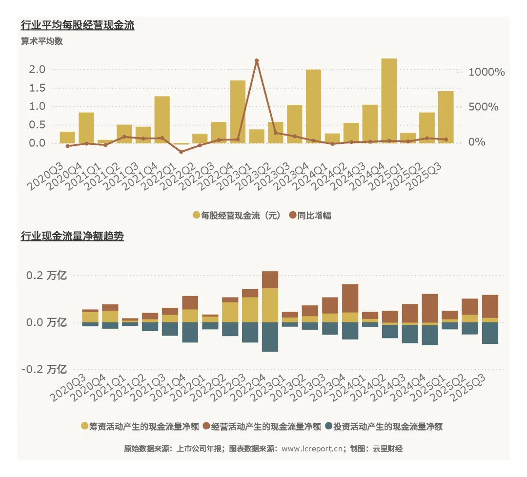2025Q3季度电池业实现平均每股经营现金流1.40元,同比增长36%,行业当期经营性现金回笼能力良好。