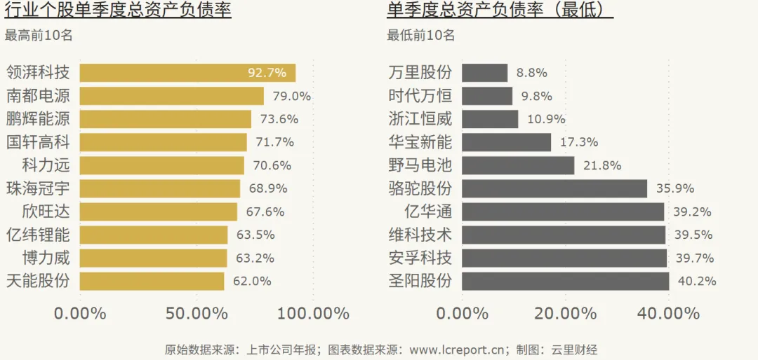 报告期末,电池业中总资产负债率最高的个股是领湃科技(300530),负债率为92.68 %;总资产负债率最低的个股是万里股份(600847),负债率为8.84 %。