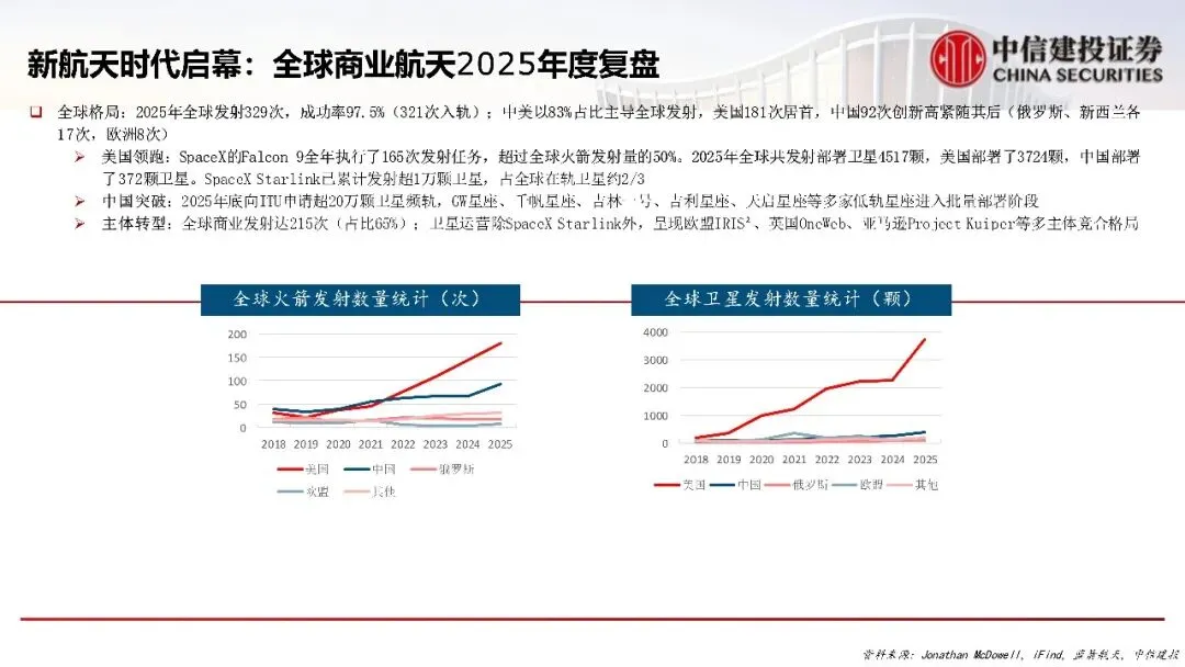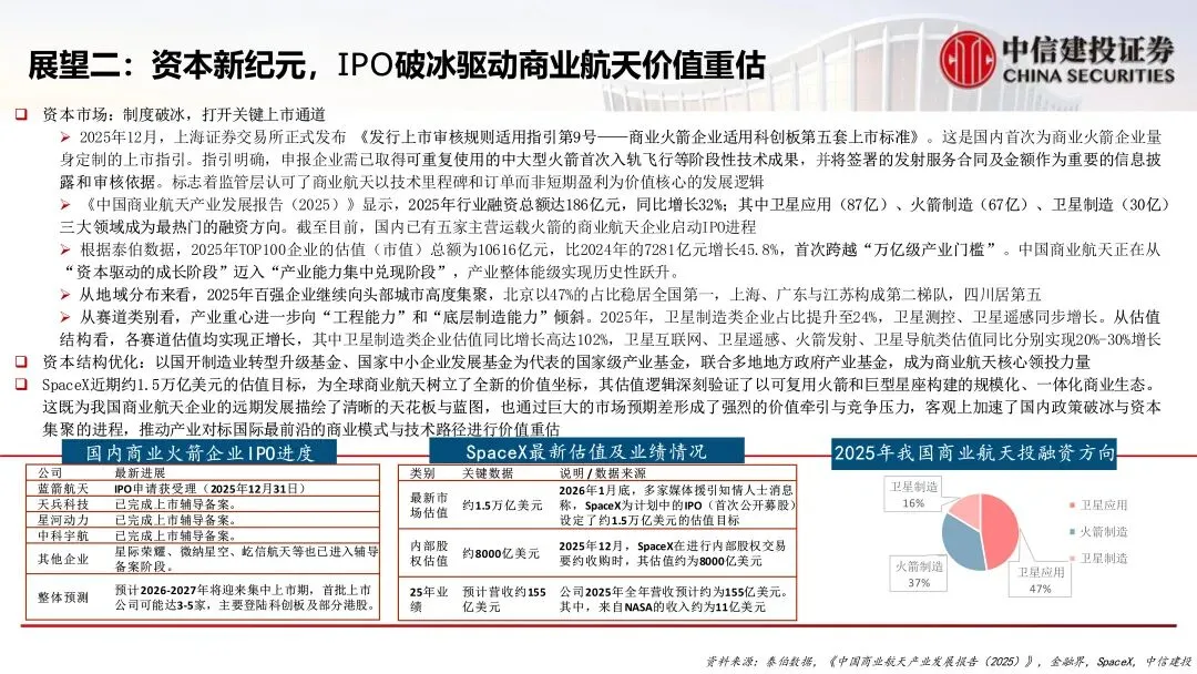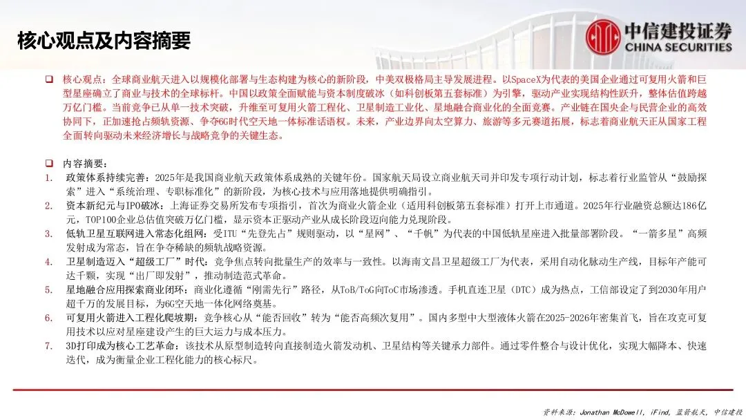 核心观点:全球商业航天进入以规模化部署与生态构建为核心的新阶段,中美双极格局主导发展进程。以SpaceX为代表的美国企业通过可复用火箭和巨型星座确立了商业与技术的全球标杆。中国以政策全面赋能与资本制度破冰(如科创板第五套标准)为引擎,驱动产业实现结构性跃升,整体估值跨越万亿门槛。当